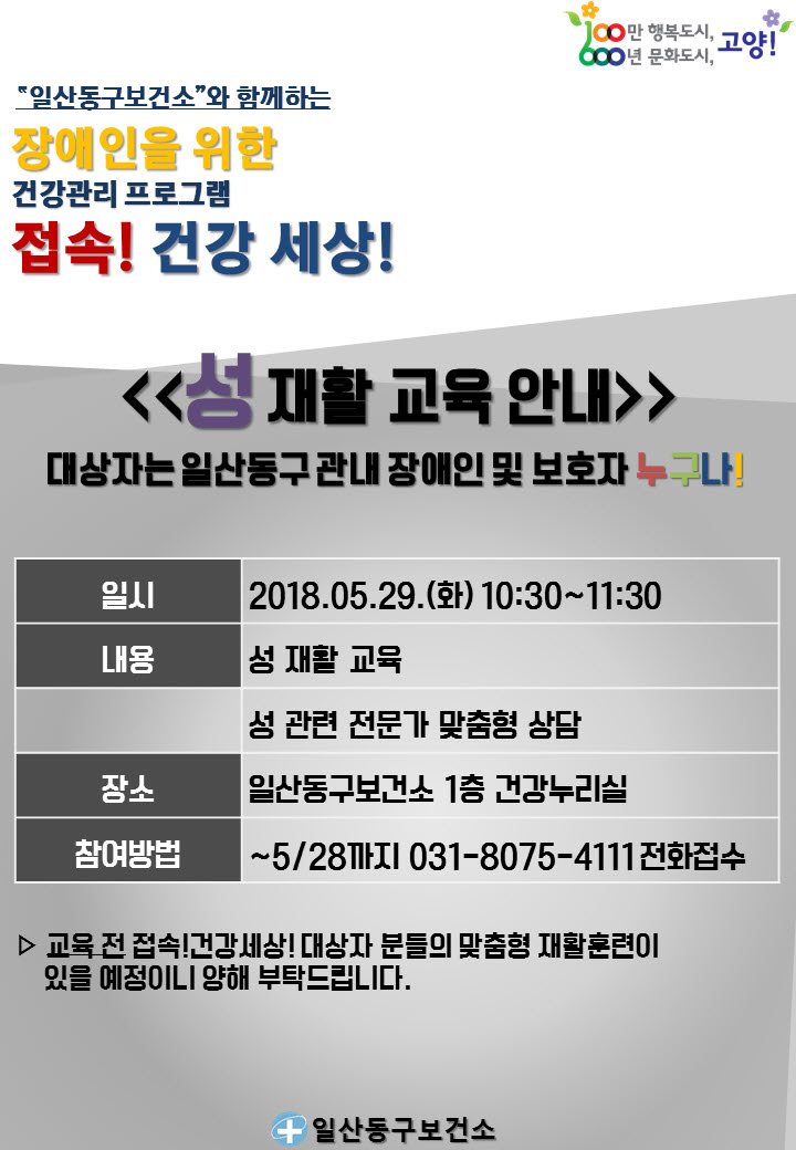 고양시 일산동구보건소는 장애인 건강증진사업의 일환으로 ‘접속! 건강세상’ 프로그램을 운영하고 있다. 오는 29일에는 ‘장애인 성 재활’을 주제로 교육을 실시한다.