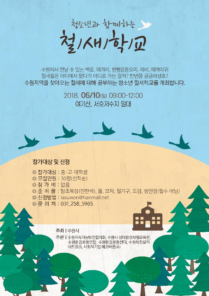 ‘청소년 철새학교’에 관한 자세한 사항은 수원시지속가능발전협의회 홈페이지(http://www.suwonagenda21.or.kr) 공지사항에서 확인할 수 있다(문의: 031-258-5965)