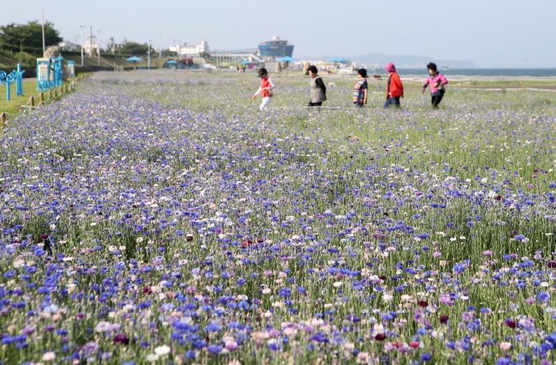 포항시 형산강변 일원(남구 해도동 138-2)에 조성된 15,000㎡(4,500평)의 꽃밭에 수레국화가 흐드러지게 피어 장관을 연출하고 있다. 이곳을 찾은 관광객들과 포항시민들은 강바람에 흔들리는 수레국화를 바라보며 즐거운 시간을 보내고 있다.배수남 기자 najomba2279@daum.net