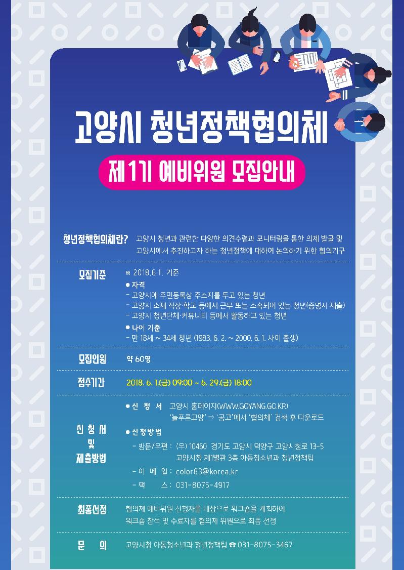 청년정책협의체는 ‘고양시 청년 기본 조례’에 근거해 청년 약 60명으로 구성할 예정이다. 지원 자격은 고양시에 주민등록상 주소지를 두고 있거나 고양시 소재 직장·학교·단체 등에서 활동하는 만 18~34세 청년이다.