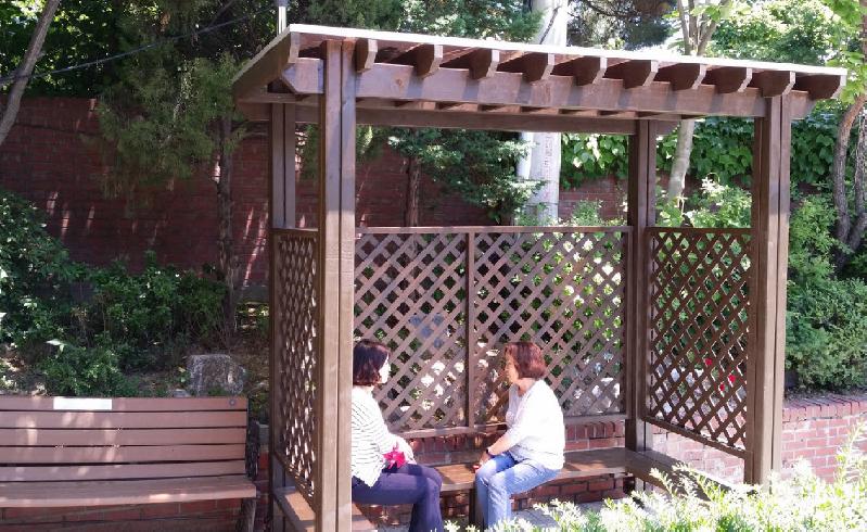 이번에 조성된 쉼터는 옥상에 차를 마시며 대화를 나눌 수 있는 그네 벤치 설치와 다양한 꽃들과 잔디 정원이 꾸며졌으며 1층 광장에 격자무늬 테두리의 파고라가 설치됐다.