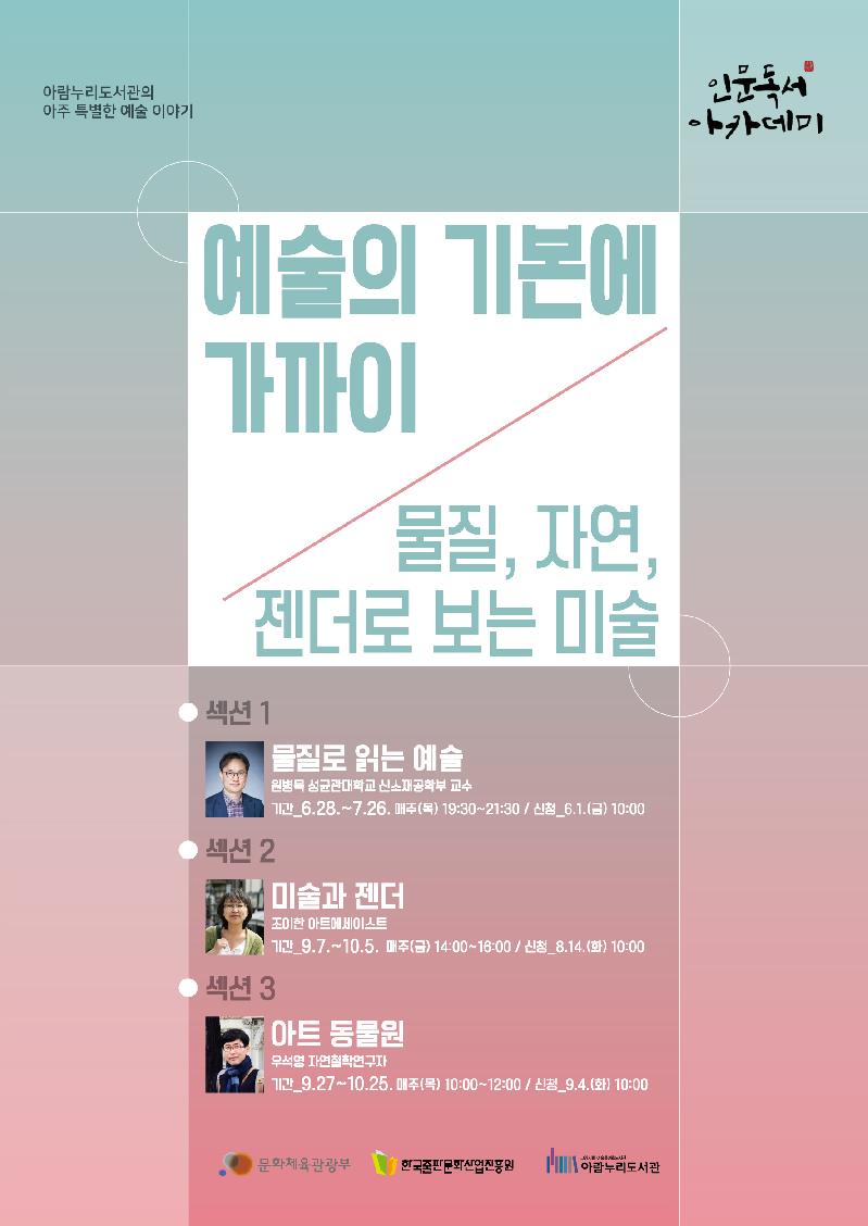 고양시 아람누리도서관이 6월부터 11월까지 물질(재료), 자연, 젠더 예술의 기본을 들여다보는 강의를 시작한다. 이번 강의는 ‘예술의 기본에 가까이’를 큰 주제로 ▲물질로 읽는 예술, ▲젠더와 미술, ▲아트 동물원이 차례로 진행된다.