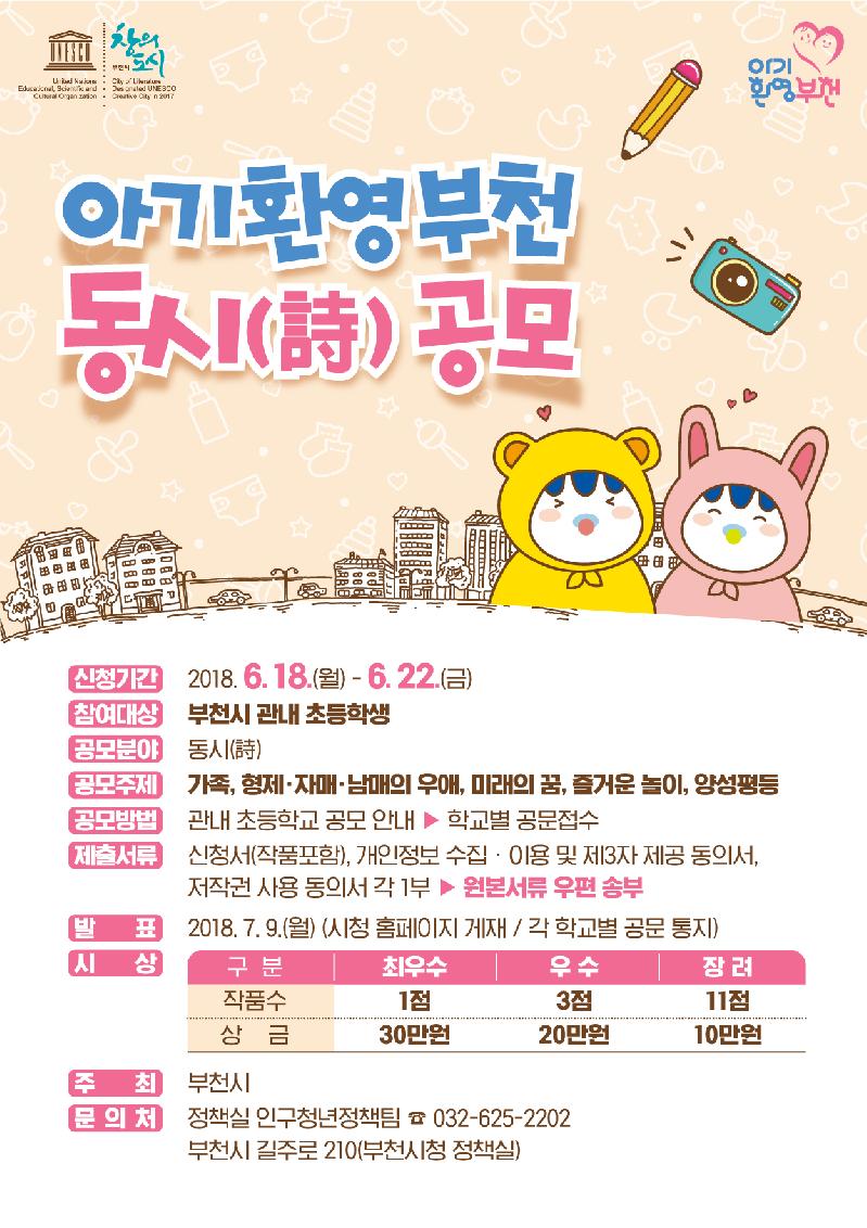 부천시는 관내 초등학생을 대상으로 ‘제1회 아기환영부천 동시(童詩) 공모전’을 개최한다.