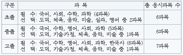 시험과목은 초졸·중졸·고졸 모두 필수와 선택으로 구분하며, 응시 영역에 따른 과목은 다음과 같다.