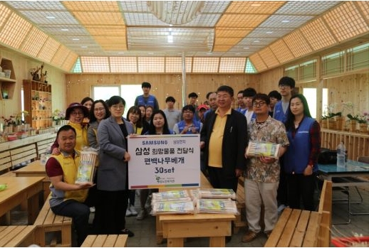 희망물품은 지난 5월 말 ‘삼성전자 평택캠퍼스’ 임직원이 체험을 통해 직접 제작한 ‘친환경 편백나무 베개’를 전달받은 것으로 이날 희망물품 전달 외에도 배다리 저수지 공원에서