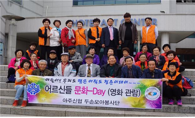 아주신협(이사장 윤양호) 두손모아봉사단장 하태봉 외 19명은 ‘어르신들 문화 Day’라는 제목으로 어르신들이 무료한 일상에서 잠시 벗어나 삶의 에너지를 얻어 행복한 삶을 영위할 수 있도록 봉사활동을 실시하고 있다.
