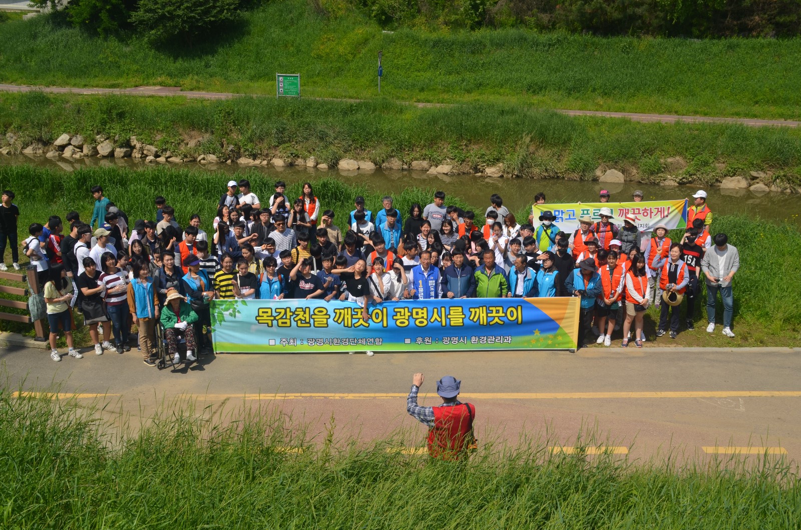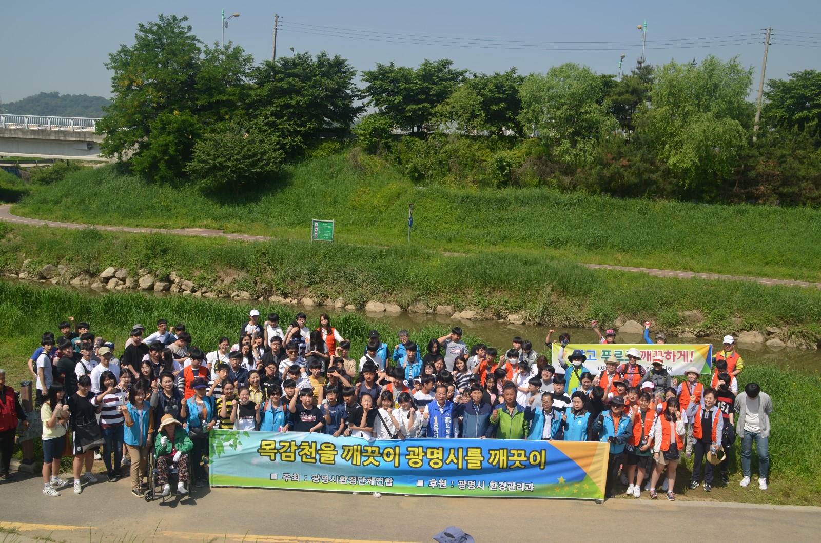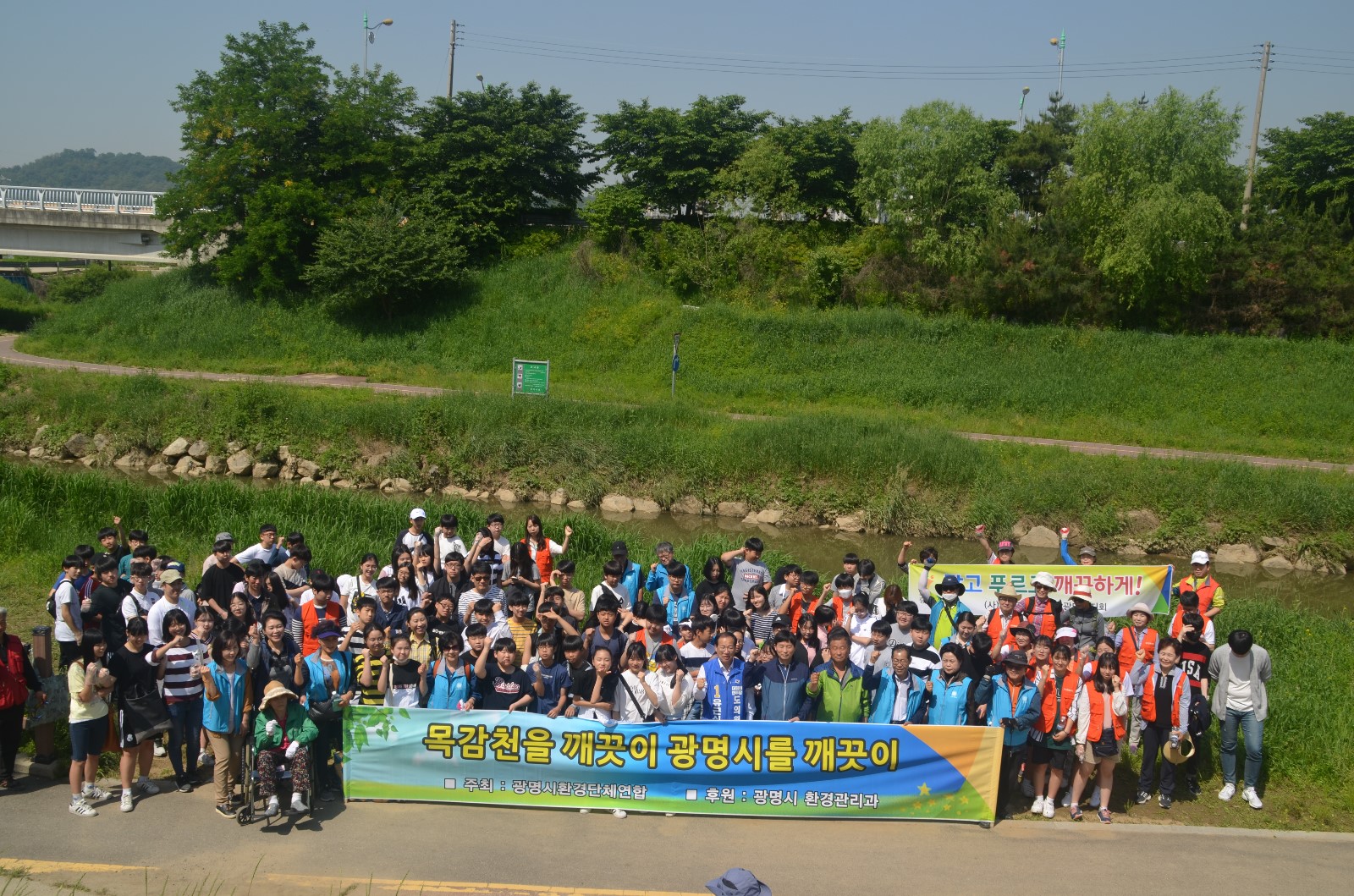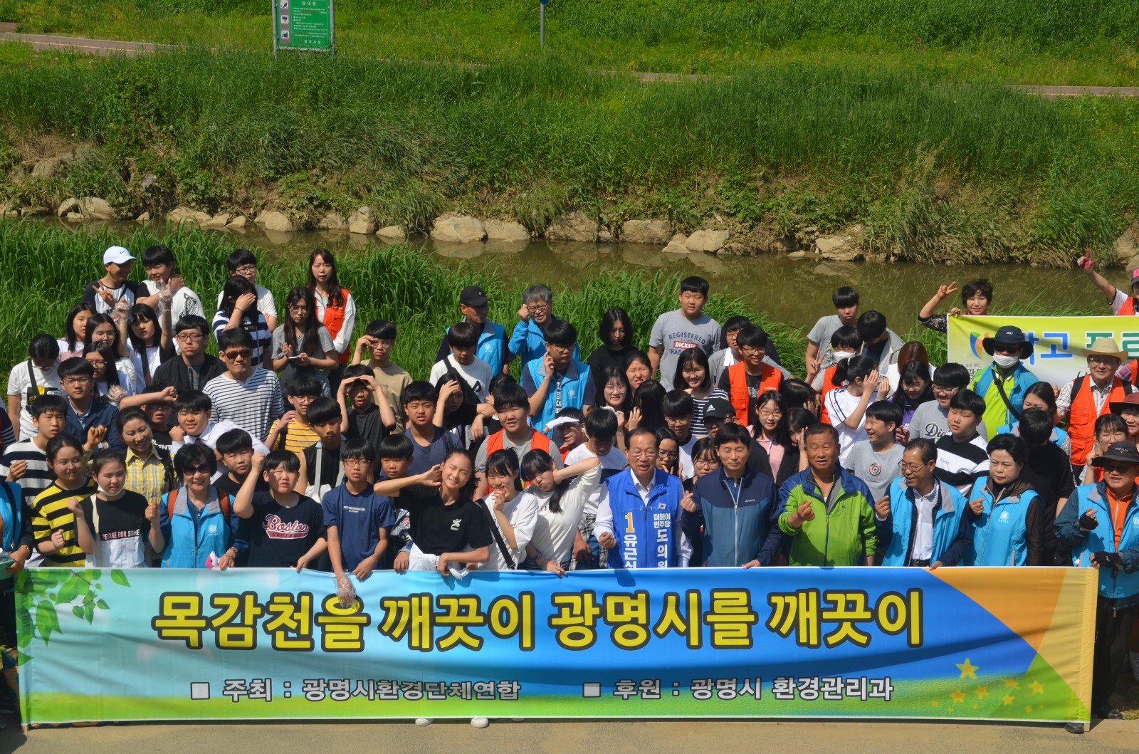 이날 봉사활동에는 환경단체 회원들과 광명시청 환경관리과 직원을 비롯해 광명시 관내 초. 중. 고 학생 등 100여 명이 모여 광명시 일원에 소재한 하천 및 지류에 대해 설명을 듣고 ‘EM배양 흙공’을 목감천에 투척해 하천 정화활동을 했다.
