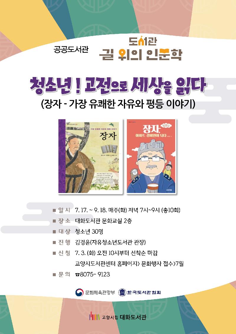 그 첫 번째 시간인 ‘청소년! 고전으로 세상을 읽다’는 청소년을 대상으로 오는 7월 17일부터 9월 18일까지 매주 화요일 저녁 7시 대화도서관 문화교실에서 진행된다.