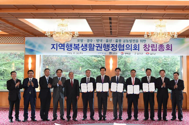 경주시와 포항시, 영덕군, 울진군, 울릉군 등 5개 시군은 주민행복과 동해안 상생발전을 위해 지역행복생활권으로 한 자리에 모였다.동해안 5개 시군은 24일 포항 청송대에서 21세기 신해양시대의 중심지인 경북 동해안의 지역행복생활권 공동발전을 위해 동해안 100만 주민을 위한 행정, 경제, 복지 등 연계협력 사업발굴, 동해안 관광문화상품 개발 등 지역협력사업 발굴을 위해 ‘지역행복생활권행정협의회 창립총회’를 가졌다.지역행복생활권은 대통령직속 지역발전위원회에서 전국을 56개 ‘지역행복생활권’으로 나누어 인접한 시군 간의 특성을 살리면서 행정구역이라는 장벽을 넘어 각종 주민 편의시설과 행정서비스를 공유해 주민들이 보다 나은 삶을 누릴 수 있도록 하는 정책이다.동해안 지역행복생활권행정협의회는 지난해 선도 사업으로 지오투어리즘(천연의 지질 자원을 관광 상품으로 활용하여 관광객을 유치하는 지질 관광)을 활용한 동해안권 통합관광사업(27억 원)을 추진하고 있으며, 실무협의회를 통해 공동발전이 가능한 사업들을 지속적으로 발굴하고 있다.