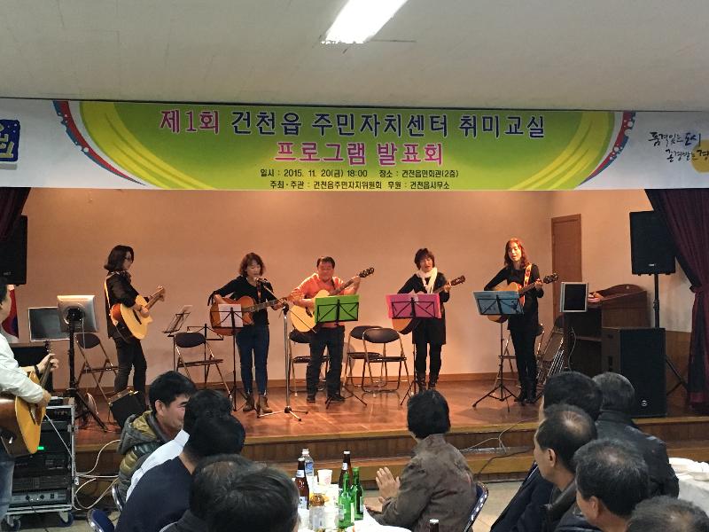 주민자치센터 취미교실 프로그램’ 발표회를 가졌다.발표회에는 김성수 건천읍장을 비롯한 관내 기관단체장, 읍민 등 150여명이 참석해 축하를 했다.1부 프로그램 발표회에서는 주민자치센터의 취미교실인 기타(초․중급반), 색소폰(초․중급반) 수강생들이 그간 배우고 익힌 기량을 뽐내는 시간을 가졌으며, 2부 행사는 어울림 한마당으로 진행되어 참석자 모두가 함께하는 시간을 가졌다.황현숙 위원장은 “그동안 취미교실을 통해 배우고 익힌 실력을 마음껏 발휘하는 발표회 자리를 마련했다.”며 “첫 발표회인 만큼 미숙한 부분이 많았지만 앞으로 더욱 더 다양한 프로그램을 개발하여 건강하고 활력 넘치는 건천읍을 만들어 나가겠다.”고 소회를 말했다.건천읍 주민자치위원회는 2006년에 구성하여 현재는 헬스, 색소폰, 기타, 스포츠 댄스 등 4개의 프로그램을 운영 중이며, 한시적으로 노래교실, 에어로빅․요가 등 수요에 맞춘 다양한 프로그램을 운영하여 건천읍민의 여가생활 및 문화욕구를 충족시켜주고 있다.