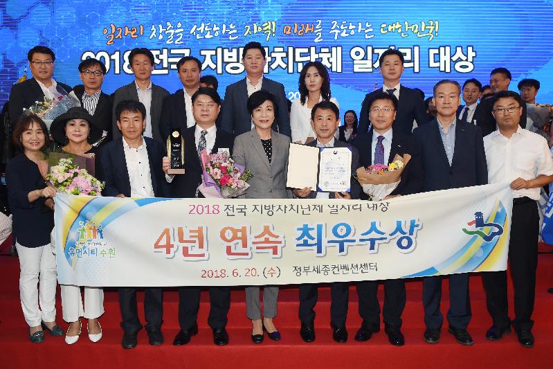 수원시가 고용노동부 주관 ‘2018년 전국지방자치단체 일자리 대상’에서 최우수상을 받으며 ‘4년 연속 최우수상’이라는 성과를 거뒀다.