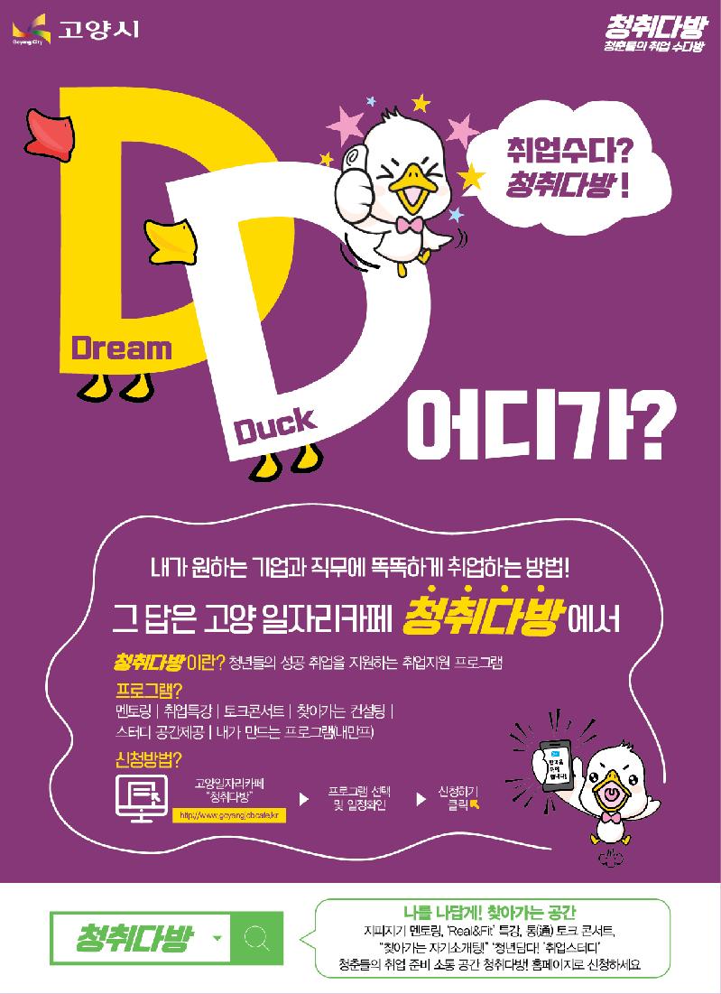 청취다방에는 취업준비생의 익살스런 캐릭터 ‘DD(Dream Duck)’도 있다. ‘DD’를 통해 취업준비의 어려움을 유쾌하게 풀어나가며 취업관련 정보를 소셜 매체를 통해 지속적으로 전달할 예정이다.