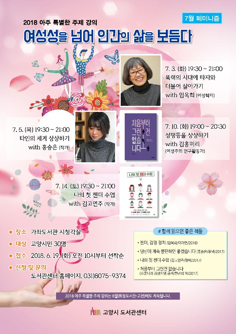 고양시 가좌도서관은 7월 한 달 ‘2018 아주 특별한 주제 강연’을 진행한다. 이번 강연의 주제는 페미니즘으로 ‘여성성을 넘어 인간의 삶을 보듬다’라는 제목 아래 네 차례에 걸쳐 여성학자, 작가 등 다양한 배경의 연사들이 강연한다.