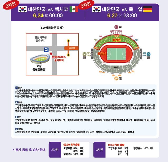 한편 심야에 경기를 관람하고 귀가하는 시민들을 위해 고양종합운동장 맞은편 공용주차장에 한해 무료 주차가 가능하며 2차전은 6월 23일 오후 10시부터 24일 오전 3시까지, 3차전은 6월 27일 오후 9시부터 28일 오전 2시까지다.