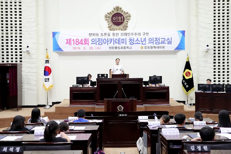 인천용일초등학교(남구 용현1·4동 소재) 학생회임원 28명이 20일 인천시의회가 개최한 의정아카데미 제184회 청소년 의정교실에 참가해 의회민주주의를 체험했다.