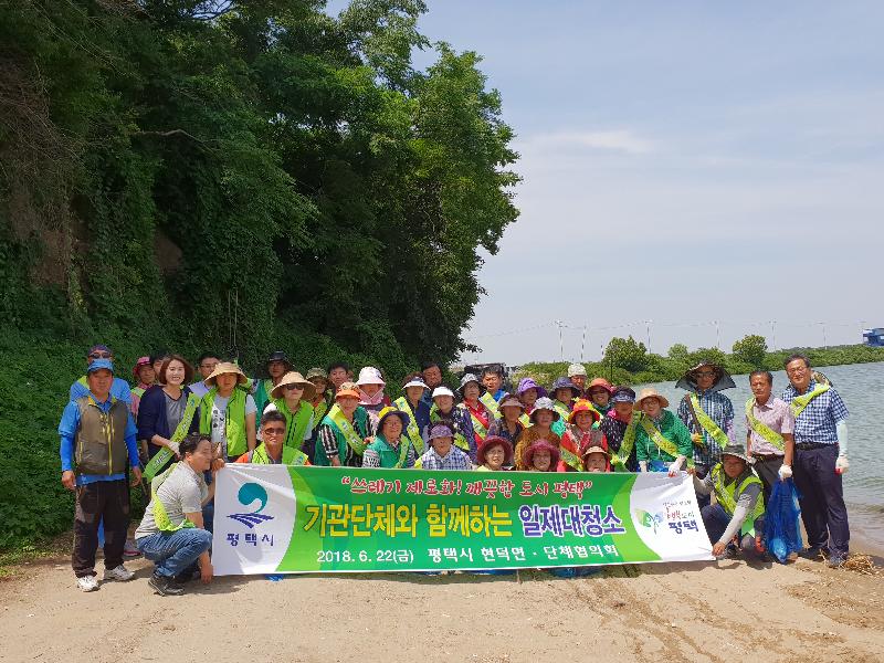 평택시 현덕면(면장 김천웅)는 22일 ‘쓰레기제로화! 깨끗한 도시 평택’을 위한 일환으로 이장협의회 등 8개 기관단체와 공무원, 마을주민 등 80여명이 참여하여 현덕면 권관리 평택호예술회관 뒤편 노랑바위 주변에서 일제 대청소를 실시했다.