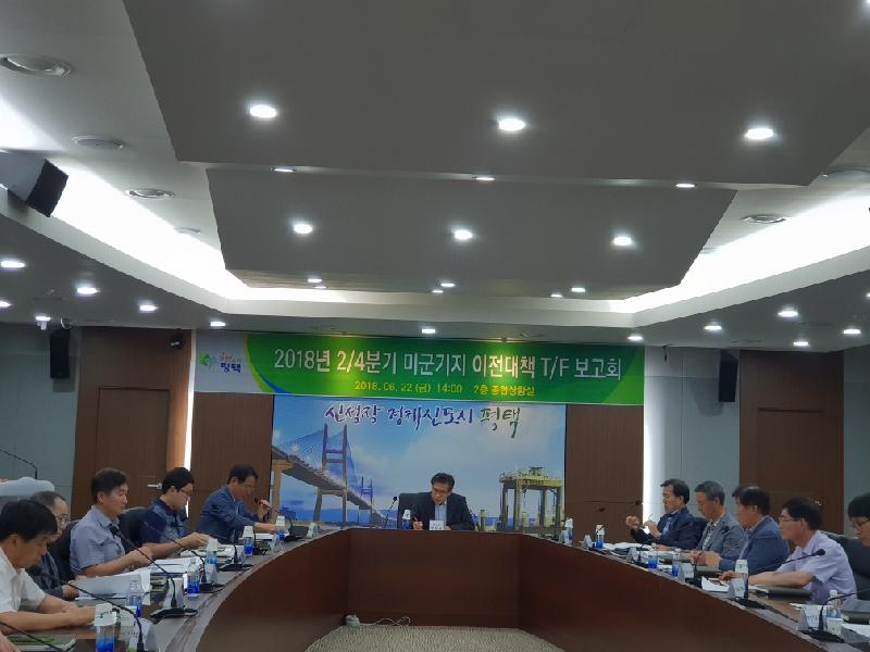 평택시는 22일 주한미군 이전에 따른 주요사업을 체계적으로 추진하고자 종합상황실에서 담당 부서장 및 관계 공무원 등 20여명이 참석한 가운데 2018년 제2분기 『미군기지 이전 대책 T/F 보고회』를 개최했다.