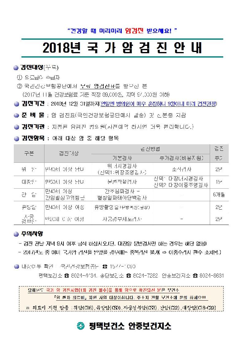 평택시 안중보건지소는 우리나라 사망원인 1위인 암을 조기에 발견, 치료율을 높이기 위해 2018년 국가 5대암 무료검진을 적극적으로 홍보하고 있다.