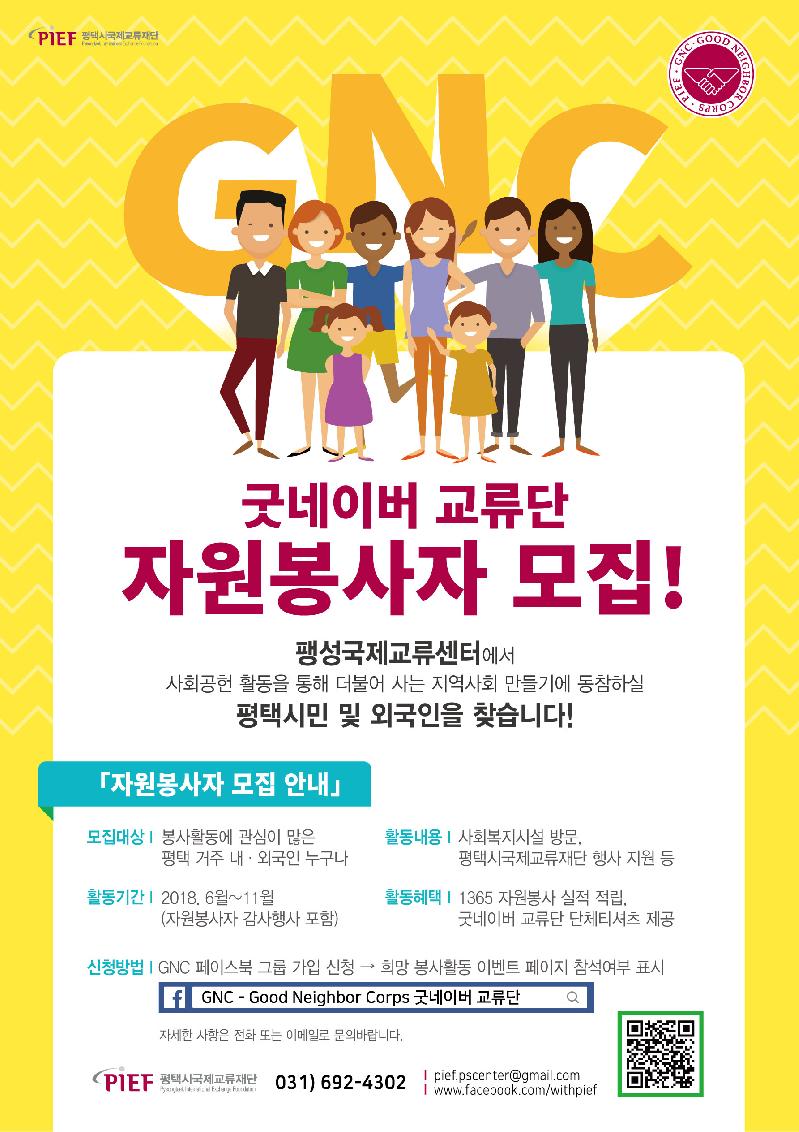 평택시국제교류재단은 한미우호증진을 위해 진행하는 ‘굿네이버 교류단(Good Neighbor Corps)’ 사업을 올해도 진행한다. 평택에 주둔 중인 주한미군 및 관계자 가족과 시민들이 함께 사회공헌 활동을 통한 지역사회 기여 및 각종 교류활동을 통해 우호를 증진시키는 것을 목적으로, 올해는 관내 복지기관 방문을 통한 봉사활동을 중심으로 진행될 예정이다.