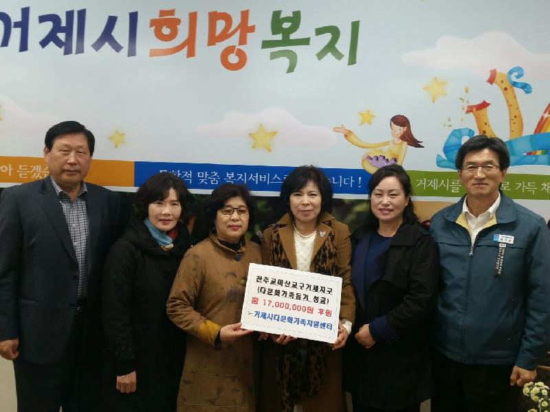 천주교 마산교구 거제지구(지구장 배진구 신부) 여성협의회 일동은 지난 24일 오전 거제시청(시장 권민호)을 방문하여 지난 8일 개최된 ‘다문화가족 돕기 바자회’를 통해 마련된 수익금 1천7백만 원을 다문화가족 지원을 위하여 거제시 다문화가족 지원센터(센터장 진승미)에 후원금으로 전달했다.