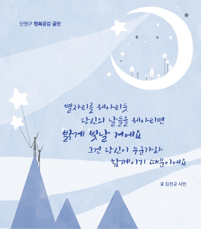 단원구청사 1층 로비에 설치된 이번 행복공감 글판 여름편은 김진규 시인의 ‘별자리를 헤아리듯 당신의 날들을 헤아리면 밝게 빛날거에요, 그건 당신이 누군가와 함께이기 때문이에요’라는 창작문구로, 뜨거운 해가 지고난 후의 선선한 여름밤을 감성적으로 표현한 디자인으로 주제가 여름에 한층 어울리도록 했다.