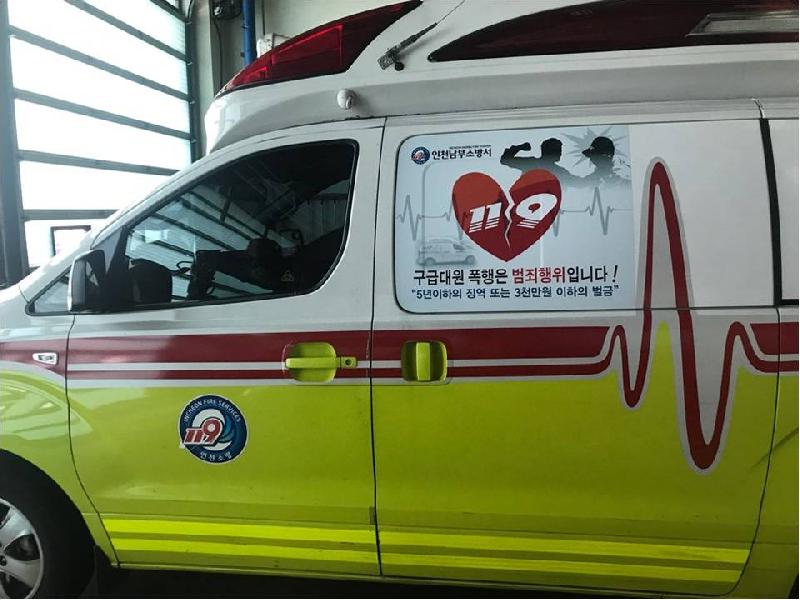 인천남부소방서(서장 류환형)는 최근 구급대원 폭행사건의 급격한 증가에 따라, 이를 근절하기 위해 관내 구급차량 6대에 구급차 외부에 구급대원 폭행 방지 랩핑을 실시했다.