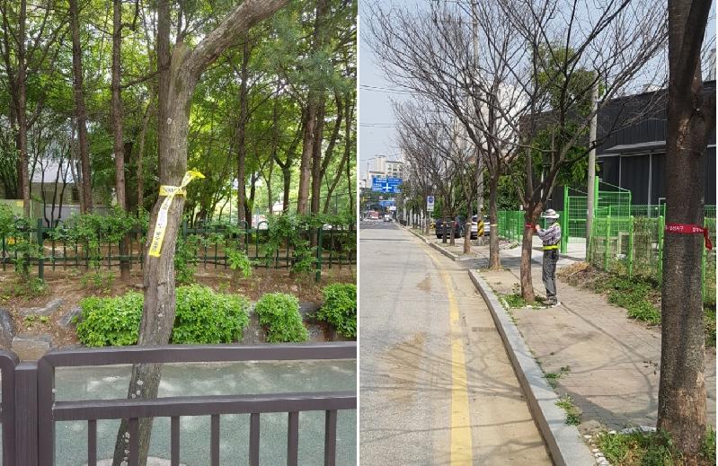 구는 지난 5월 23일부터 6월 11일까지 관내 가로수 3만여 그루를 대상으로 전수조사를 실시했다. 조사 결과 고사되거나 생육 상태가 매우 불량해 벌목이 필요한 나무가 147그루, 생육 상태가 상당히 불량하거나 버섯이 발생되어 지속적으로 관리가 필요한 관찰대상수목이 182그루로 나타났다. 벌목대상수목은 자체인력을 투입하거나 조경업체에 위탁해 순차적으로 벌목을 추진하고 있다.