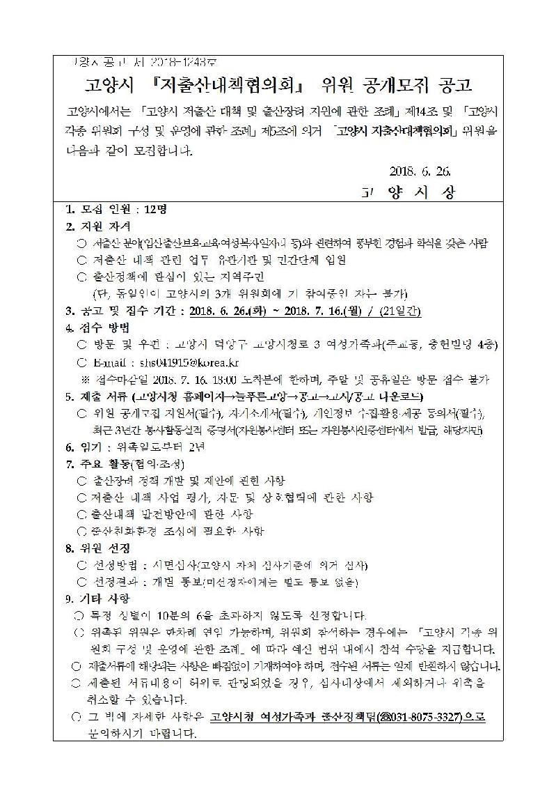 고양시는 장기화 되고 있는 저출산 문제에 적극 대응하고자 민·관 협의체인 ‘고양시 저출산대책협의회’를 설치하고 위촉직 위원을 공개모집 한다.