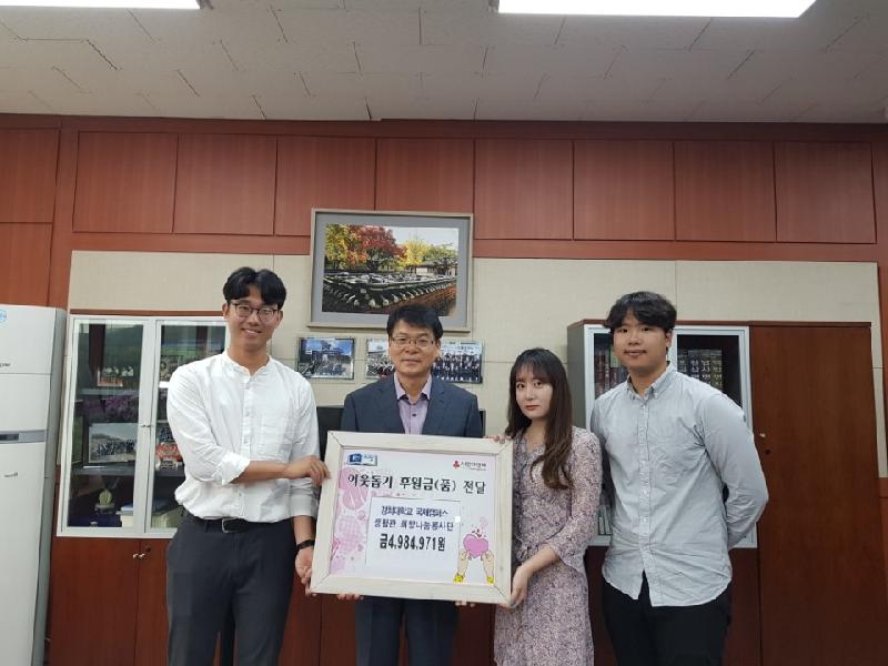 기탁식에 참석한 하종범 봉사단장과 단원 정잎새, 오민섭, 김효은 학생은 “작은 정성이지만 어려운 이웃에 도움이 되길 바라는 마음”이라고 말했다.
