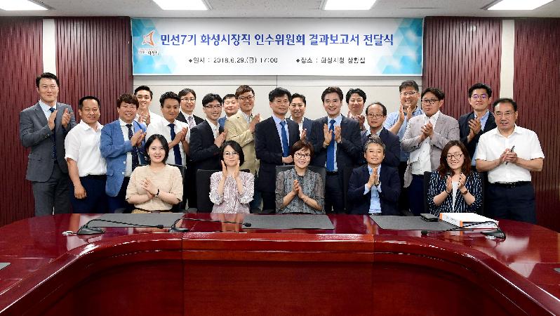 | 화성시장직 인수위원회가 10일간의 일정을 마무리하고 활동보고서를 당선인에게 전달하고 기념촬영을 하고 있다. |