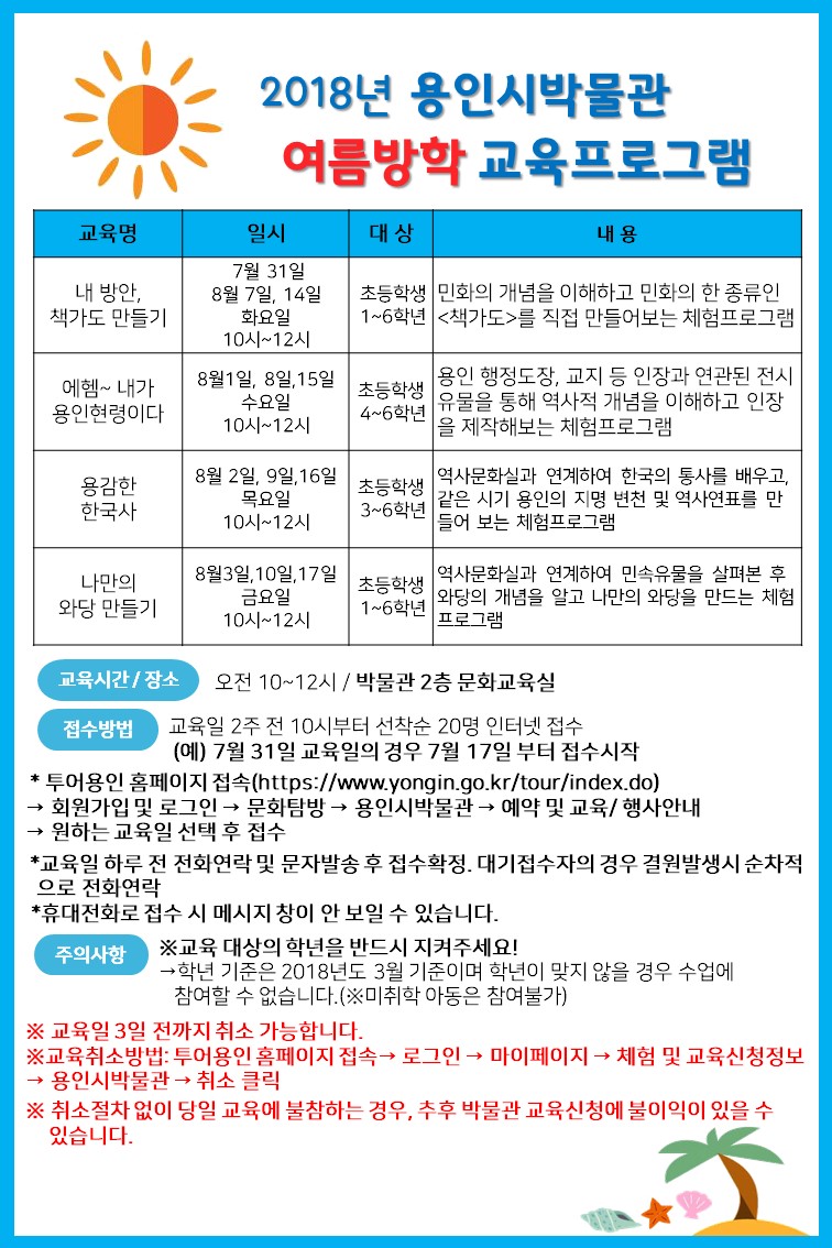 용인시는 7~8월에 동백동에 소재한 ‘용인시박물관(옛 문화유적전시관)’에서 여름방학을 맞은 초등학생을 대상으로 용인의 역사와 문화를 쉽게 이해할 수 있는 4개의 무료 교육프로그램을 운영한다.