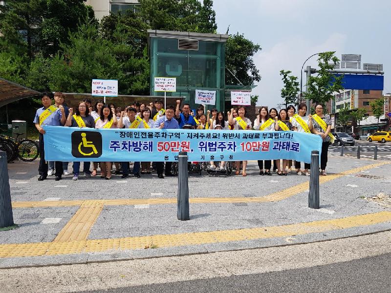 용인시 기흥구는 29일 기흥역 사거리 일대에서 구청직원, 장애인편의시설 기술지원센터, 기흥장애인복지관 직원 50여명이‘장애인주차구역 준수 캠페인’을 펼쳤다.