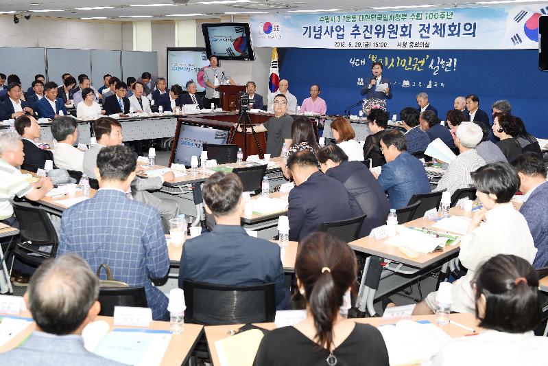 수원시 3.1운동·대한민국 임시정부 수립 100주년 기념사업 추진위원회는 6월 29일 시청 중회의실에서 전체회의를 열고, 추진위원회와 수원시 각 부서가 발굴해 제안한 기념사업을 심의했다.