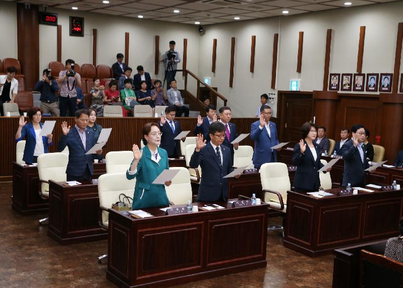 | 2일 광명시의회 개원식에서 의원들이 선서를 하고 있다. |