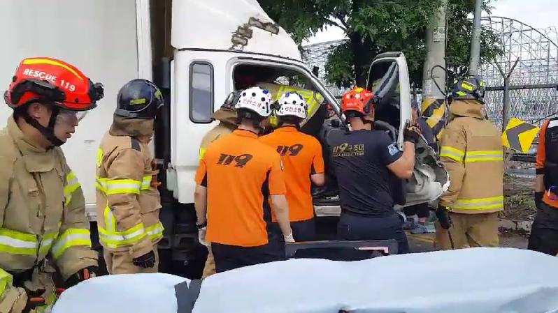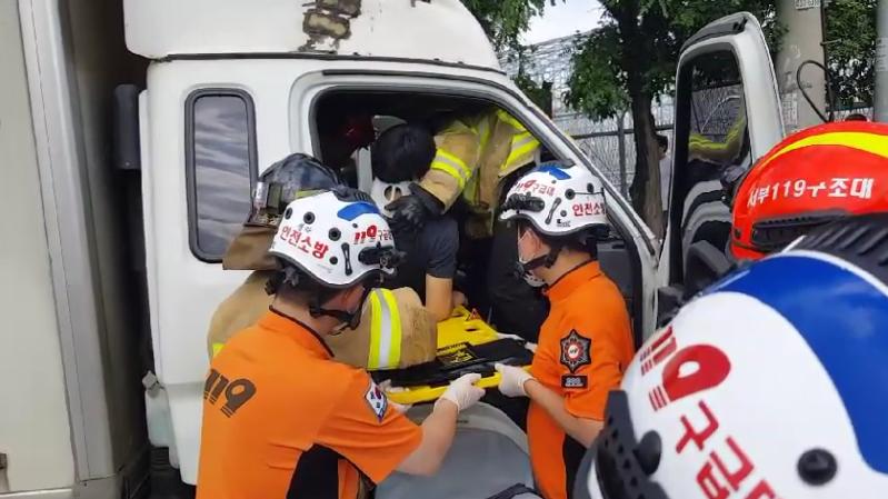 인천서부소방서(서장 김준태)는 3일 오후 3시 44분경 원창동 396-5 2부두 앞 도로에서 2.5톤 트럭이 정지돼 있는 트레일러를 들이받았다는 신고를 받고 출동해 2.5톤 트럭 운전자 정 모 씨(남, 47세)를 구조해 병원으로 이송했다.