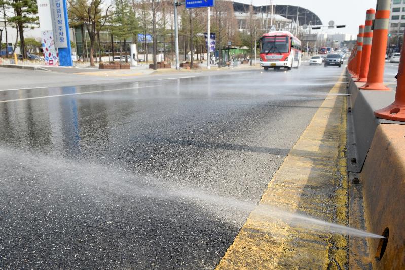 모아둔 빗물을 자동차 도로 표면에 뿌리도록 설계된 노면 살수 시스템은 미세먼지를 줄이고 여름철 도심 열섬현상을 완화하는 역할을 하고 있다.
