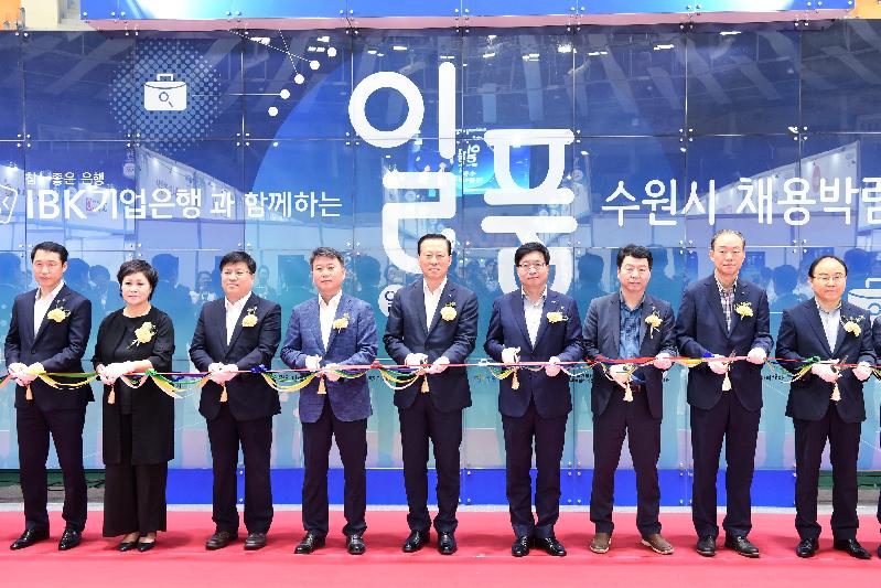 | 염태영 수원시장(오른쪽 4번째)과 김도진 IBK기업은행장(염 시장 왼쪽), 관계자들이 일품 채용박람회 시작을 알리는 테이프 커팅을 하고 있다. |