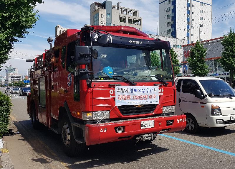 | 출동 중인 소방차 양보의무 위반! 과태료 100만원 홍보 사진. (사진제공=인천남부소방서 제공) |