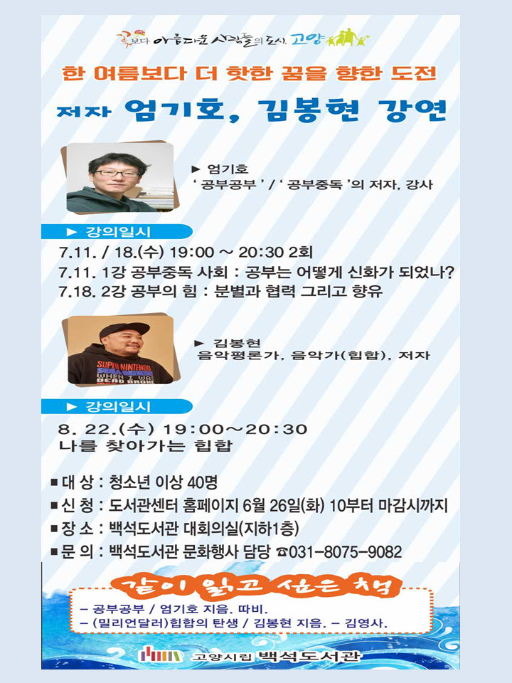 고양시 도서관센터 백석도서관은 오는 11일과 18일, 8월 22일 3일에 걸쳐 ‘한 여름보다 더 핫한 꿈을 향한 도전’ 저자 특강을 진행한다.