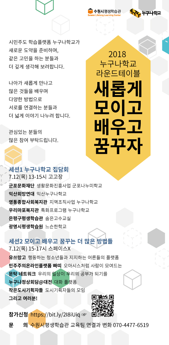 수원시평생학습관은 오는 12일 오후 1시 팔달구 평생학습관에서 ‘새롭게 모이고 배우고 꿈꾸자’를 주제로 ‘2018 누구나학교 라운드테이블(원탁회의)’을 연다.