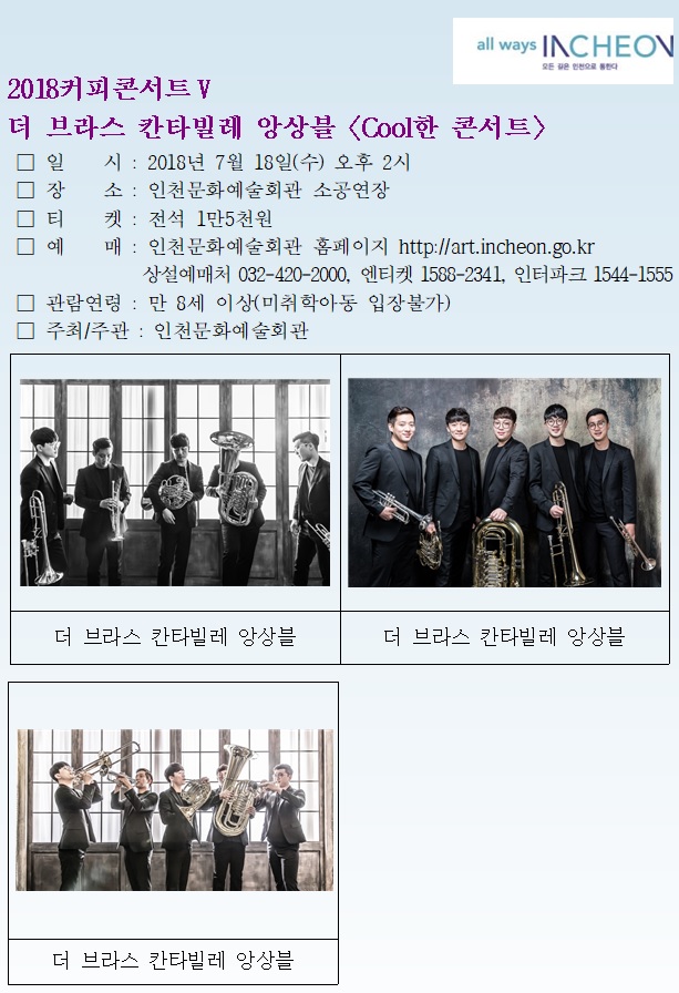 인천문화예술회관은 “차가운 아이스 커피 한잔, 그리고 금관악기의 시원하고도 경쾌한 연주로 뜨거운 여름날의 무더위를 확 날려버리시길 바란다.”고 말했다.