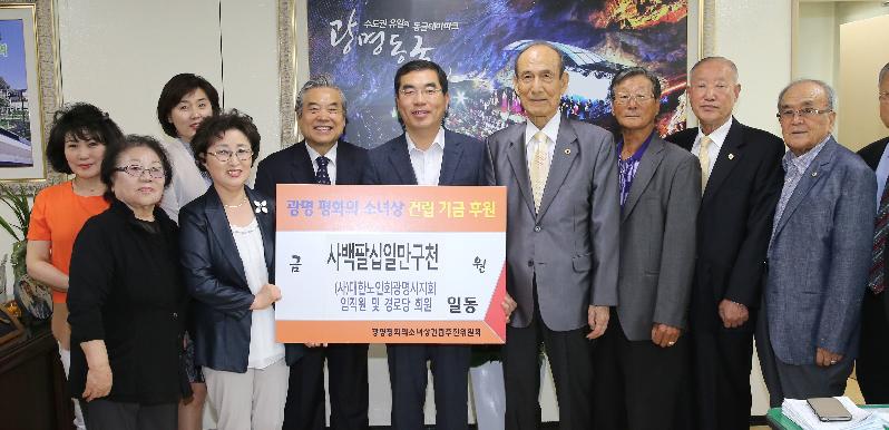 이현철 지회장은 “우리시에서 일본군 위안부 피해 할머니들의 인권과 명예회복을 바라며, 평화의 소녀상을 건립하는 의미 있는 일을 추진하게 되어, 관내 116개 경로당 회원들과 임직원이 동참하게 되었다”며 “특히 광명5동 경로당은 회원들이 손수 제작한 손뜨개 수세미 판매수익금을 쾌척하였으며, 노인대학 등에서 지금도 모금이 계속 진행되고 있다”고 말했다.