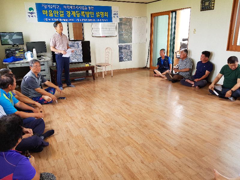 평택시(시장 정장선)는 2018년 1차 지적재조사사업지구인 당거2지구(오성면 당거리 4-3번지 일원) 현황도로 경계등록방안 마련을 위해 지난 6일 당거3리 경로당에서 주민설명회를 개최했다.