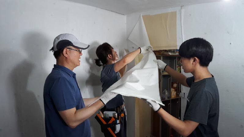 봉사자들은 도배 및 장판작업을 위해 살림살이를 밖으로 꺼내 본격적인 작업을 시작했다. 밖에서는 도배지에 풀을 바르고 안에서는 풀을 바른 도배지를 정성껏 벽에 덧발랐다. 주방도 다시 한 번 꼼꼼히 닦아 실내를 깔끔하게 마무리 했다.