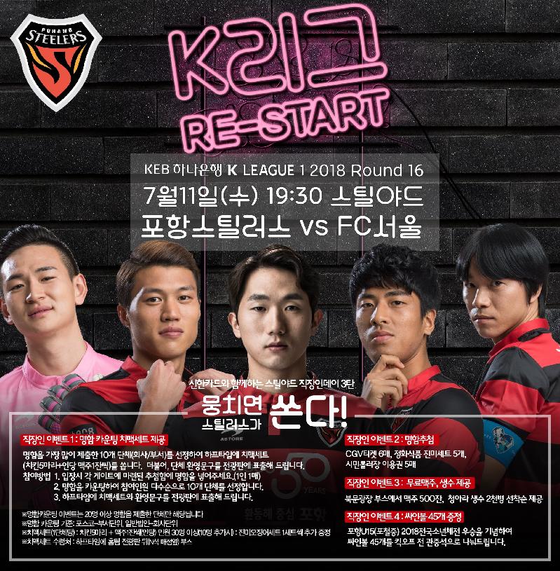 포항스틸러스가 11일(수) 저녁 7시 30분 포항스틸야드에서 펼쳐지는 KEB하나은행 K리그1 2018 16라운드 홈경기에서 서울을 상대한다. 포항은 이번 2018 시즌 세 번째 주중 홈경기를 ‘신한카드와 함께하는 스틸야드 직장인데이’로 정하고 팬들을 위한 다양한 이벤트와 선물을 준비했다. ‘직장인데이’에 걸맞게 명함을 활용한 이벤트가 준비되었다. 경기장에 입장하면서 명함을 제출하면 하프타임 추첨을 통해 CGV티켓 6매, 정화식품 진미세트 5개, 울릉심층수 청아라 5박스, 아우노 슈가 선물세트 10개 등 푸짐한 경품을 선물한다. 단, 명함은 1장만 제출하여야 하며 2장 이상 제출이 발견되면 모든 당첨은 취소된다. 개별 직장인 대상 추첨에 더해 동료들과 ‘뭉치면 스틸러스가 쏜다’. 20명 이상 명함을 제출한 단체 중 가장 많이 제출한 10개 단체를 선정해 하프타임에 치맥세트(치킨 5마리, 1인당 ‘칭따오’ 맥주 1잔)를 포항스틸러스에서 ‘쏜다’. 더불어 해당 단체의 환영문구를 전광판에 표출할 예정이다. 명함을 세는 기준은 포스코는 부서단위, 그 외 일반법인은 회사단위로 한다. 선정된 단체는 N석 매점 옆 부스에서 치맥세트를 수령하면 된다. 퇴근 후 직장동료와 함께 축구를 관람하며 치킨과 맥주도 즐길 수 있는 절호의 기회다. 새롭게 단장한 홈구장 스틸야드도 이번 서울과의 홈경기를 반드시 찾아야 할 이유다. N석 1층에 위치한 서포팅존 좌석이 161석에서 638석으로 확대, 교체됐다. 구단 고유 색상인 빨강과 검정을 활용한 바닥 도색까지 더해져 서포팅에 최적화된 좌석으로 거듭났다. 서포팅존만의 다양한 프로모션과 응원 이벤트도 진행된다. 포항스틸러스 공식맥주 ‘칭따오’ 시음회가 서포팅존 한정으로 진행된다. 서포터즈와 함께 응원을 도울 치어리더들도 새로운 볼거리다. W석 1층에 위치한 프리미엄 좌석도 306석에서 932석으로 확대, 교체하였다. 업그레이드된 프리미엄 좌석을 체험해 볼 수 있는 ‘프리미엄 체험존’은 올 하반기 한정으로 운영한다. 시즌카드 회원, 당일 입장권 소지자 등 정상적으로 경기장에 입장한 관중이라면 누구나 선착순으로 업그레이드 된 공간인 ‘프리미엄 체험존’을 추가비용 없이 체험해 볼 수 있다. 스틸야드 북문광장에서는 포항 직장인들의 시원한 경기관람을 위해 포항스틸러스 공식맥주 ‘칭따오’ 500잔과 청아라 생수 2,000병이 선착순으로 주어진다. 경기 시작 전에는 2018 전국소년체전에서 우승을 차지한 포항 U15 포철중학교 선수들이 우승을 기념하여 스틸러스 사인볼 45개를 관중들에게 선물할 예정이다. 또한 이번 경기는 ‘청림동 시민서포터즈’(단장 이민규)를 구성해 항상 열렬한 응원을 아끼지 않는 청림동 주민들에게 감사하는 마음을 담은 ‘청림동의 날’이기도 하다. 킥오프 직전에는 청림동 주민을 대표해 김수만 청림동 시민서포터즈 고문의 시축이 진행된다. 한편, 포항은 서울과 스틸야드에서 맞대결을 펼친다. 포항은 지난 4월에 있었던 서울 원정에서 이른 시간 터진 김승대의 골로 앞서갔으나 서울 고요한에게 2골을 연이어 허용하며 1-2 역전패를 기록했다. 때문에 이번 경기에선 반드시 승리를 거두겠다는 각오다. 오스트리아 비엔나에서 임대복귀한 이진현이 스틸야드에서 포항 팬들과 첫 만남을 가진다. 서울과의 경기에서 홈 팬들에게 강렬한 인상을 남기겠다는 각오다. 반면 서울은 핵심 미드필더 신진호가 퇴장 징계로 인해 결장한다. 포항은 스틸야드에서 서울을 상대로 4연승을 기록 중이다. 통산 전적은 57승 48무 49패로 포항이 다소 우위에 있다.