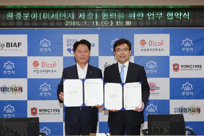 이는 부천시가 한국철도기술연구원, ㈜디에이피(대표 권순박), 클레스(주)(대표 조선영)와 공동으로 제안한 ‘도로 미세먼지를 저감하기 위한 R&D 사업’이 환경부 환경산업선진화사업으로 선정됨(3년간 27억원 지원)에 따라 사업을 함께 추진하기 위한 협약이다.