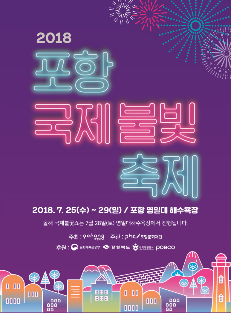 포항시는 오는 7월 25일부터 7월 29일까지 5일간 영일대해수욕장 일원에서 대한민국 최고의 여름축제 2018 포항국제불빛축제를 개최한다. 올해로 15회를 맞는 2018 포항국제불빛축제는 “빛으로 일어서는 포항”이라는 주제로 지난해 지치고 힘들었던 포항시민에게 힐링과 희망의 메시지를 전달하고 지역경제 활력의 마중물이 되고자 다채로운 프로그램으로 꾸며진다. 메인 프로그램인 국제불꽃쇼 “그랜드 반짝반짝 퐝퐝쇼”는 지난해 세계에서 가장 권위 있는 불꽃경연대회인 몬트리올 국제불꽃경연대회 우승팀인 영국(Jubilee), 아시아 최고의 불꽃연출력 중국(Sunny)팀과 평창올림픽의 개·폐막식에서 감동과 희망의 불꽃연출을 선보인 한국(한화)가 함께하여 “힐링”을 주제로 화려하고 수준 높은 불꽃쇼를 펼친다.