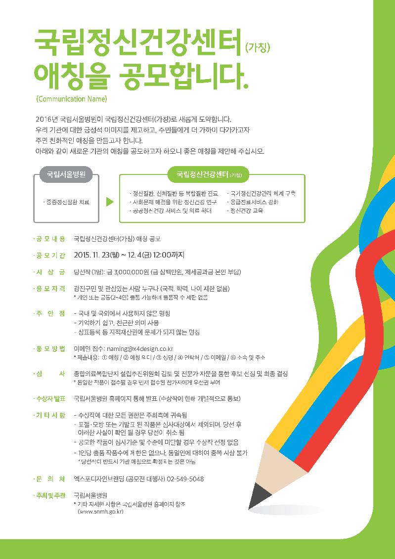 국립서울병원은 2016년 초 (가칭)국립정신건강센터로 새롭게 문을 열며 주민 친화적인 애칭을 공모한다.