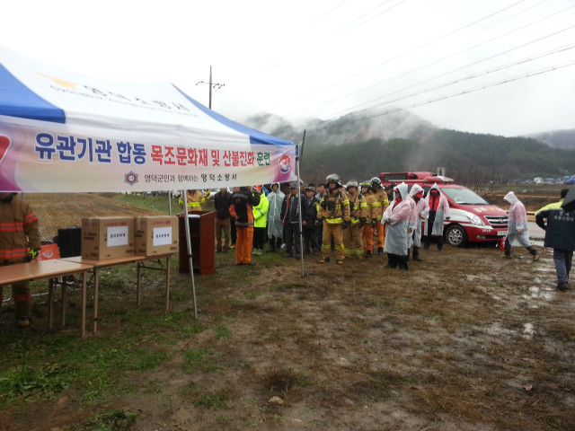 영덕소방서(서장 오원석)는 11월 25(수) 오전 11시부터 달산면 용평리 소재 모고재에서 영덕소방서, 영덕군청, 영덕경찰서, 달산면, 국유림관리소 등 5개 유관기관 65명과 장비 9대가 동원된 '유관기관 합동 목조문화재 화재진압훈련'을 실시하였다. 유관기관 합동 목조문화재 화재진압훈련은 현장 초동조치와 유관기관,단체별 역할분담을 통한 대응능력 향상으로 목조 문화재 진압체제를 구축하는데 목적이 있다.