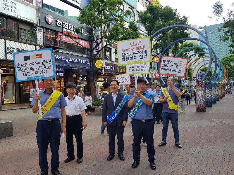 이들은 ‘감정노동자에게 반말하지 않기’,‘계산대에서 카드나 현금을 공손히 전달하기’,‘콜센터 상담 후 인사하며 전화 끊기’ 등 감정노동자에게 따뜻한 배려와 말 한마디를 건네는 소비자 인식의 변화를 당부하는 유인물을 배포했다.